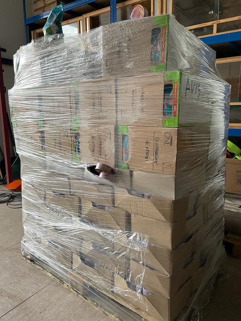 Wir haben eine große Palette hochwertiges Nass- und Trockenfutter geliefert bekommen.